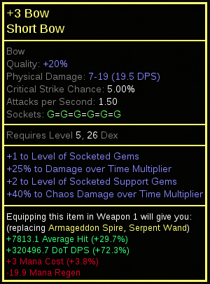 " Hey there, just found some time to look into your PoB. Right now you're sitting at about 440k Shaper DPS on your ED. While that isn't bad at all, we of course want to max out the DPS so you have a smooth experience with higher tier bosses. Check out the difference in damage with a crafted bow: ![]() Quite significant, right? Damage climbs up to 600k on ED. If you get a 21^20 ED and level the Empower to 3 it'll jump to 750k, which is almost double your current DPS. It really is all in the gem levels. It'll also free up some nodes on the passive tree since you don't need the shield nodes anymore, pushing you to about 6k life and giving you another 2 jewel sockets. By SSF-viable I mean that you don't need any specific uniques that you have to be lucky to find. Everything can be crafted with enough time. :) The opposite of knowledge is not illiteracy, but the illusion of knowledge.
