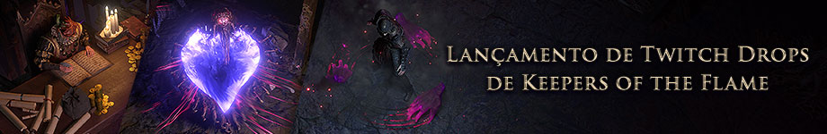 Twitch DropsPara comemorar o lançamento de Path of Exile: Keepers of the Flame, realizaremos duas semanas de Twitch Drops, a partir das 13h do dia 31 de outubro (PDT).1ª Semana de Twitch Drops: Decoração de Refúgio Tesoureiro do Exilado + Efeito de Personagem Garra do Lorde da FendaInício: 31 de outubro, às 12h (PDT) (out. 31, 2025 3:00 PM (GMT-4) em seu fuso horário) Término: 8 de novembro, às 2h59min (PST) (nov. 08, 2025 5:59 AM (GMT-5) em seu fuso horário) Você receberá a Decoração de Refúgio Tesoureiro do Exilado e o Efeito de Personagem Garra do Lorde da Fenda após 3 horas de tempo de exibição acumulado em qualquer canal da categoria Path of Exile durante a primeira semana de lançamento. 2ª Semana de Twitch Drops: Efeito Finalizador de Raros de Pancada de XeshtInício: 8 de novembro, às 3h (PST) (nov. 08, 2025 6:00 AM (GMT-5) em seu fuso horário) Término: 16 de novembro, às 2h59min (PST) (nov. 16, 2025 5:59 AM (GMT-5) em seu fuso horário) Você receberá o Efeito Finalizador de Raros de Pancada de Xesht após 3 horas de tempo de exibição acumulado em qualquer canal da categoria Path of Exile durante a primeira semana de lançamento. Os itens são garantidos para todos que assistirem a qualquer transmissão de Path of Exile pelo tempo especificado acima. Essa promoção está disponível para todas as contas. Apoie um streamerPara apoiar os streamers da nossa comunidade, também ofereceremos o Efeito Portal Encarnação do Pavor ao comprar ou presentear com 2 assinaturas da Twitch de qualquer nível de 8 de novembro, às 3h, até 16 de novembro, às 2h59min (PST). Para participar: