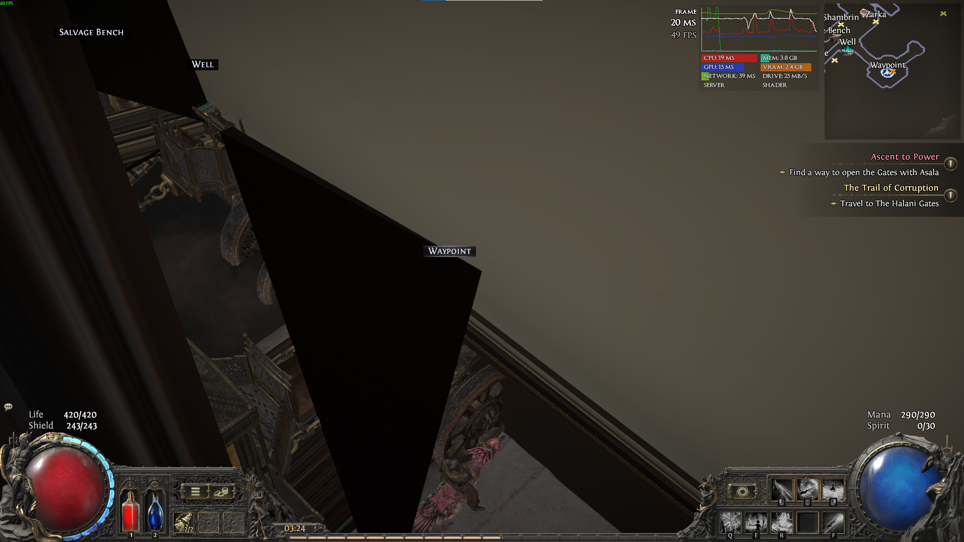This bug occured while inside the Ardura Caravan; to my knowledge this bug was introduced in 0.3 and it has not been fixed (I've made another post about this last expansion). At random points, rendering breaks and the game becomes unplayable due to rendering errors. I presume this is an issue with the upscaling methods because they stop working when the bug occurs. The bug manifests either from models bugging out and rendering stretched across the whole screen, the screen going black and things not rendering (only the health/mana orbs and hotbars), Skill Tree icons flickering and not rendering correctly, item art being broken etc. Edit: this bug also occurs in POE1 when using FSR upscaling since 3.27 Keepers of the Flame. The game must be exited every time this happens, logging in and out does not fix the issue. ![]() ![]() Última edição por AgentSpooks#1780 em 17 de dez. de 2025 20:26:33 Último bump em 17 de dez. de 2025 20:25:45